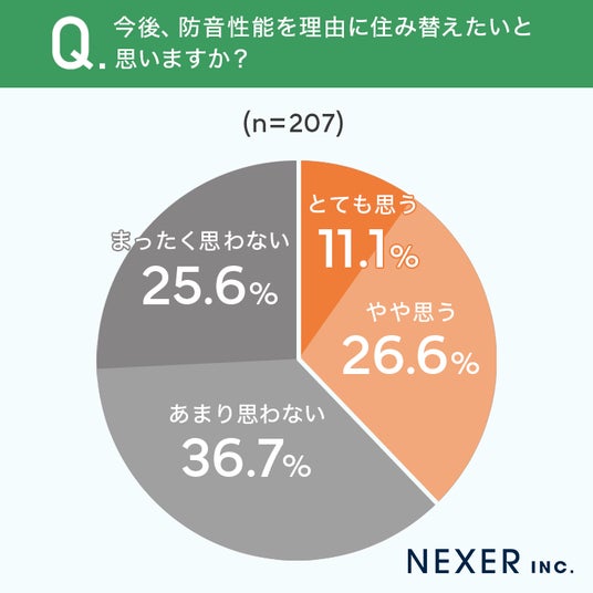 その結果「とても思う」が11.1%、「やや思う」が26.6%で、合わせて37.7%の方が防音性能を重視した住み替えに前向きな姿勢を示しました。