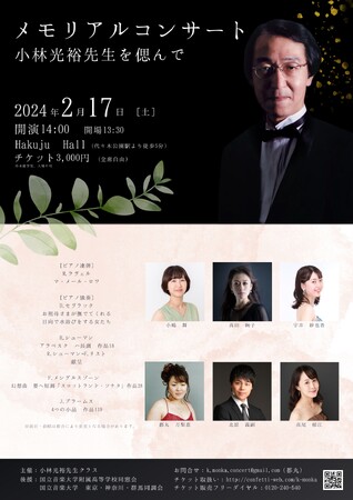 小林光裕先生クラス主催、『メモリアルコンサート~小林光裕先生を偲んで~』が2024年2月17日 (土)にHakuju Hall(東京都渋谷区富ヶ谷1-37-5(株)白寿生科学研究所本社ビル 7F)にて開催されます。