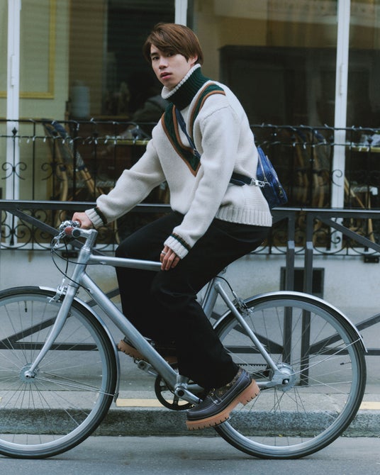 デニムシャツ¥720,500、シャツ¥213,400、パンツ¥291,500、ネクタイ¥36,300、ブーツ¥216,700、バッグ「LV × ザ・ダージリン リミテッド ナイル GM」 ¥709,500、リング「ル ダミエ ドゥ ルイ・ヴィトン」(ホワイトゴールド×ダイヤモンド) ¥1,595,000、ウォレット「ジッピー・ウォレット ホリゾンタル」(日本限定) ¥145,200、LV バーム 000 インフィニット ドリーマー¥23,100