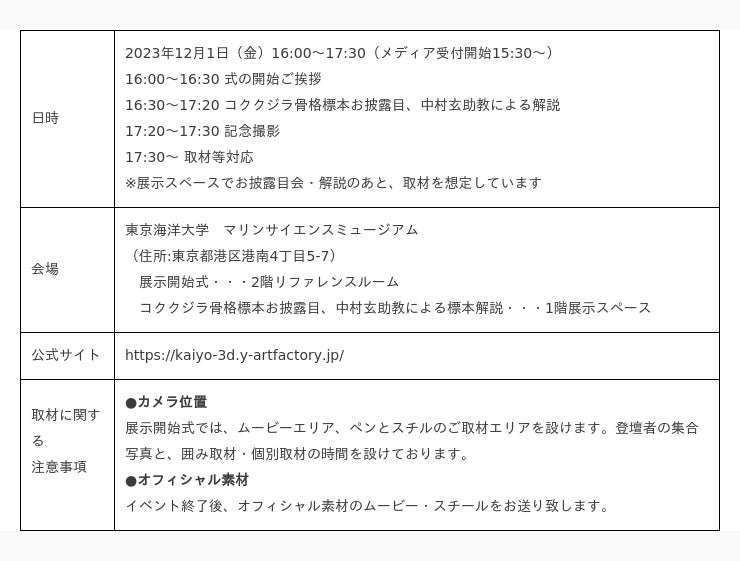 日本3D教育協会は、2023年12月1日(金)東京海洋大学マリンサイエンスミュージアムにて「コククジラの骨格標本 展示開始式」を開催いたします。このイベントは、次世代へ豊かで美しい海を引き継ぐために、海を介して人と人とがつながる“日本財団「海と日本プロジェクト」”の一環です。