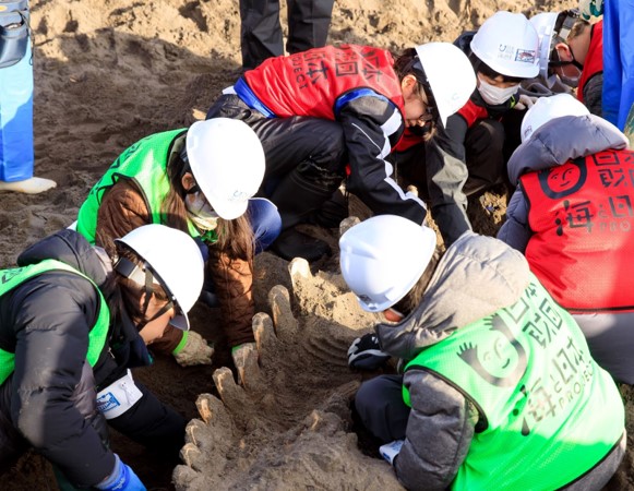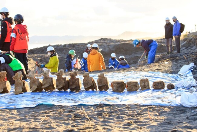 2023年1月に、南房総市の漁港に2016年に打ち上げられ、砂浜に埋めていたコククジラの骨格を掘り起こして3Dデータ化する、後世に貴重な標本を残すための取り組み(※)が、中学生の研究生たちによって行われました。今回、掘り起こしたコククジラの骨格標本が東京海洋大学 マリンサイエンスミュージアムに展示されることになり、その展示の開始を記念した式を執り行います。