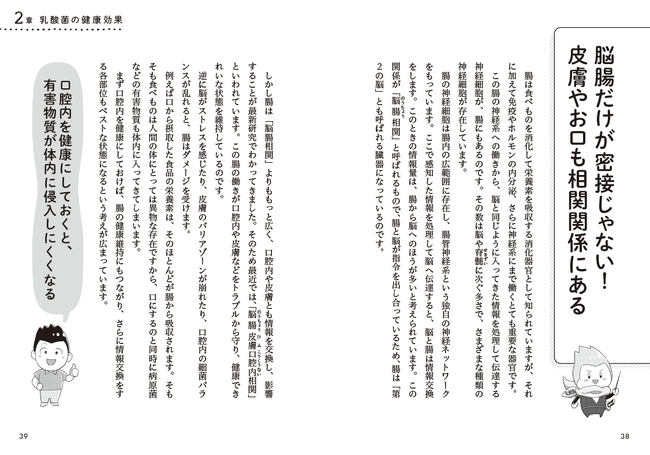 「脳腸皮膚口腔内相関(のうちょうひふこうくうないそうかん)」という体内システムの最新情報をお届けするとともに、腸を改善する乳酸菌の驚くべき健康効果をマンガやイラストを含めてわかりやすく解説します。