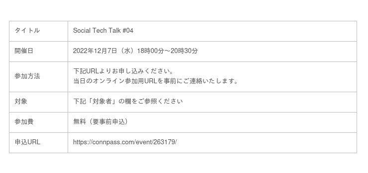 株式会社エイチームのグループ会社であるQiita株式会社(本社:名古屋市中村区、代表取締役社長:柴田健介、以下当社)は、株式会社 日立製作所(以下、日立製作所)と共同で、2022年12月7日(水)に無料オンラインセミナー「Social Tech Talk #04」を開催します。