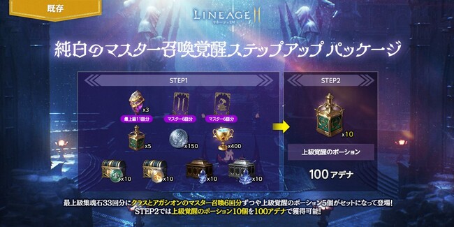 クラスとアガシオンのマスター召喚6回分と、「上級覚醒のポーション(刻印)」5個などがセットになった「純白のマスター召喚覚醒ステップアップ パッケージ」が登場しました。