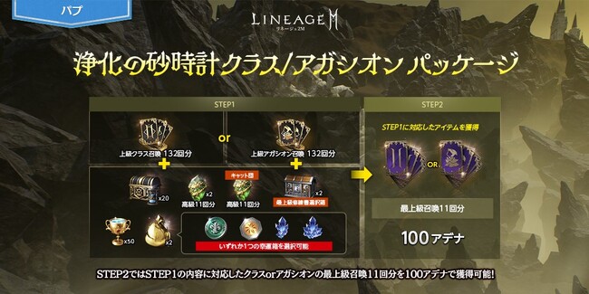 「大天使の砂時計箱(刻印)」20個に、クラスまたはアガシオン召喚132回分、「大天使の高級集魂石II(11回)(刻印)」2個などがセットになった「浄化の砂時計クラス/アガシオン パッケージ」が登場しました。