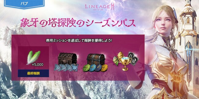 期間中、毎日達成していくデイリー ミッションと2週間でクリアを目指すシーズン ミッションで構成された、新規シーズンパス「象牙の塔の探検シーズンパス」が登場します。デイリー ミッション、シーズン ミッションをそれぞれ達成してシーズンパスEXPを獲得し、パス レベルを上昇させることで、「ダンジョン時間補充石選択箱(イベント)」や「クラス/アガシオン獲得券(11回)(イベント)」など、様々なアイテムを報酬として獲得することができます。また、1,000,000アデナを使用することでプレミアム報酬を有効化することができます。最終報酬として、「アインハザードの祝福」5,000を獲得することが可能です。