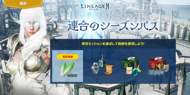 期間中、毎日達成していくデイリー ミッションと2週間でクリアを目指すシーズン ミッションで構成された、新規シーズンパス「連合のシーズンパス」が登場します。デイリー ミッション、シーズン ミッションをそれぞれ達成してシーズンパスEXPを獲得し、パス レベルを上昇させることで、「連合の成長箱(イベント)」や「連合主の下賜品(イベント)」などのイベントアイテムのほか、「魔力が宿った羊皮紙(刻印)」「ピュアエリクサー(刻印)」など、様々なアイテムを報酬として獲得することができます。また、1,000,000アデナを使用することでプレミアム報酬を有効化することができます。最終報酬として、「アインハザードの祝福」20,000を獲得することが可能です。