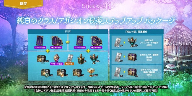 「女神の秘薬箱(刻印)」50個に、クラスまたはアガシオンのマスター召喚6回分と最上級召喚44回分、「純白の証(刻印)」1個などがセットになった「純白のクラス/アガシオン秘薬ステップアップ パッケージ」が登場しました。