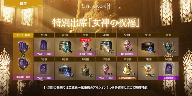 毎回もらえる「女神の最上級獲得券選択箱(刻印)」1個のほか、「女神のマスター クラス/アガシオン獲得券(11回)(刻印)」や「女神の伝説級アガシオン挑戦券(1回)(刻印)」などのアイテムを受け取ることができます。