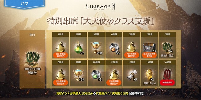 毎回もらえる「大天使の高級クラス獲得券II(6回)(刻印)」1個のほか、「大天使の高級クラス獲得券II(11回)(刻印)」や「大天使の最上級修練書選択箱(刻印)」「大天使の英雄級クラス挑戦券II(1回)(刻印)」などのアイテムを受け取ることができます。