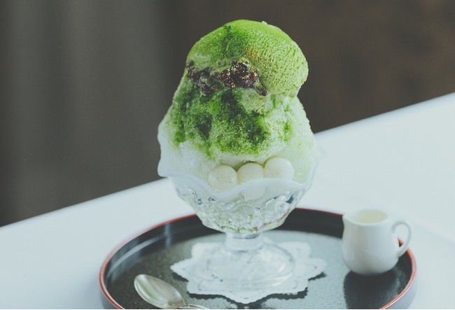 昭和20年代より続く歴史ある宇治抹茶金時は、時代によりアレンジを加え現代まで続くロングセラーかき氷。苦みが控えめでクリーミーな抹茶アイスと北海道羊蹄山産小豆を使用した粒あん、もちっとした白玉を使用。氷はやや粗挽きでザクザク感があって、アイスやあんことの相性がよい一品。