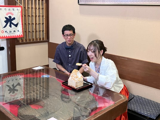 300年以上の歴史を持つ赤福。そんな赤福の名物といえば、「赤福餅」ですが…。夏限定でいただけるのが「赤福氷」。抹茶蜜がかかったかき氷の中には冷えても固まらないよう作られた特別なお餅とあんこが。天野の感想はまさかの「〇〇の味!」