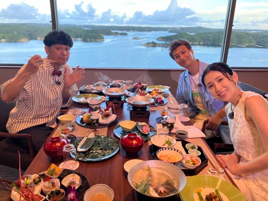 英虞湾をクルーズしながら船で到着したのは、絶景のお宿。季節の地元食材を使った絶品懐石料理が旅を締めくくります。あまりのおいしさに天野から名言(迷言?)「〇〇い」が誕生!