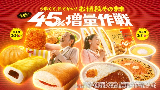 株式会社ファミリーマート(本社:東京都港区、代表取締役社長:小谷建夫)は、2026年9月に創立45周年を迎えます。継続して取り組んできた5つのキーワードを土台とし、「いちばんチャレンジ」を合言葉に活動をしていきます。このたび「いちばんちょっとおトク」を目指した取り組みの一環として、さまざまな人気商品を「お値段はそのまま」で創立45周年を記念して45%増量する「うまくて、ドでかい!お値段そのまま なぜか45%増量作戦」キャンペーンを2026年3月24日(火)から全国のファミリーマート約16,400店舗にて開催いたします。春開催だからこそ実現した、生コッペパンや中華まん、ラーメンなど、初登場商品を含む全14種類を、週替わりで発売いたします。
