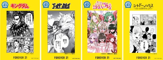 「Play fashion!」をミッションに掲げ、”グッドコミュニティ共創カンパニー”を目指す株式会社アダストリア(本部:東京都渋谷区渋谷2-21-1、代表取締役社長:木村 治)が展開する「FOREVER 21」は、2024年5月に創刊45周年を迎える集英社発行の週刊“ヤングジャンプ”とのコラボレーションTシャツ全12型を2024年6月20日(木)10時より、FOREVER 21 JAPAN ONLINE FLAGSHIP STORE、公式WEBストア .st(ドットエスティ)、ZOZOTOWNにて先行予約販売を開始、2024年7月11日(木)10時頃から通常販売を開始します。今回は“ヤングジャンプ”の8作品「キングダム」「ゴールデンカムイ」「君のことが大大大大大好きな100人の彼女」「シャドーハウス」「九龍ジェネリックロマンス」「ジャンケットバンク」「BUNGO」「少年のアビス」とコラボレーション。購入者特典として全40種のトレーディングカードをTシャツ1枚購入につき、1枚プレゼントいたします。