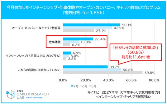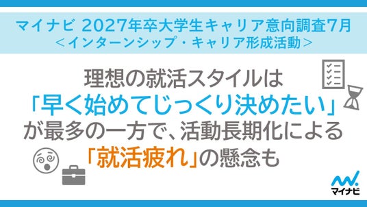 株式会社マイナビ(本社:東京都千代田区、代表取締役 社長執行役員:土屋芳明)は、2027年3月卒業見込みの全国の大学生、大学院生(1,856名)を対象に実施した、「マイナビ 2027年卒大学生キャリア意向調査7月<インターンシップ・キャリア形成活動>」の結果を発表しました。