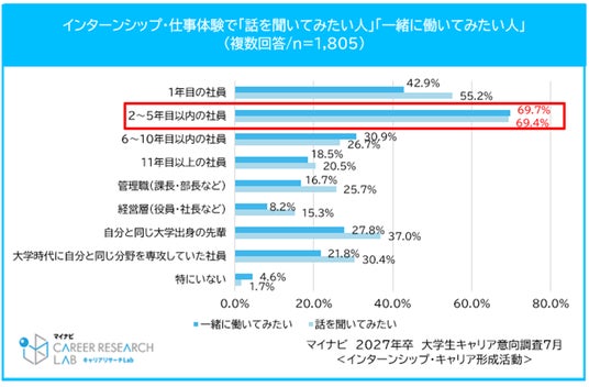 インターンシップ・仕事体験で「話を聞いてみたい人」と「一緒に(プログラム内で)働いてみたい人」をそれぞれ聞いたところ、どちらも「2~5年目以内の社員」が最多で約7割となった。自由回答を見ると「1年目の人より仕事に慣れており、会社の現場のことをよく知っていそうだから」「自分の数年後のキャリアを想像しやすい」「歳の近い人と働くことで実際にそこに入社した時のイメージを作り出すことが出来るため」という意見があり、学生は入社後数年間の様子を具体的にイメージしたいという意識があり、「入社後数年でどのような仕事をしているのか」、「どのような成長を遂げているのか」といった将来の自分の姿を描くための重要な手がかりとして捉えていることがわかる。【図5、6】