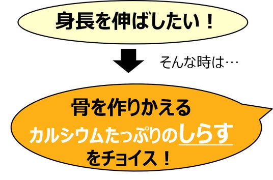tottoメモ…新しく骨を作りかえる作用を持つカルシウムは必要不可欠。腸でのカルシウムの吸収を促進させる効果があるビタミンDやC、マグネシウムも一緒に食べることで吸収率がアップ! カルシウムとビタミンDの両方を摂取できるしらすは、まさに身長UPの神食材!