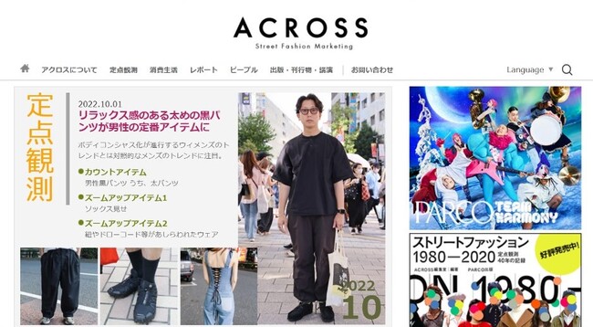 1978年に創刊した、パルコのファッションとカルチャーのシンクタンク部門が運営するメディア。1980年8月より毎月東京のストリートで「定点観測」を実施し、今日まで若者のファッション文化や風俗を研究してきました。2000年以降、オンラインメディア「ACROSS(https://www.web-across.com/)」で公開中。「定点観測」の他にも、ひとり1人の生活史を日記スタイルで記録する「今月の消費生活」という企画も人気です。