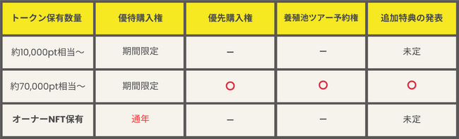 支援パッケージの購入で付与されたトークン、または支援パッケージの販売終了以降に立ち上がる「二次流通マーケット」にて購入したトークンを特定の数量、持ち続ける(=保有すること)で得られる特典(または権利)は下記のとおりです。