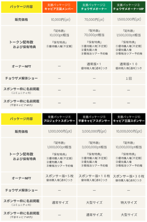 今回販売する6つの支援パッケージのいずれかを購入し、プロジェクトをご支援いただくサポーターの皆さまには「支援特典」と「トークン保有特典」の2つの特典をご提供します。