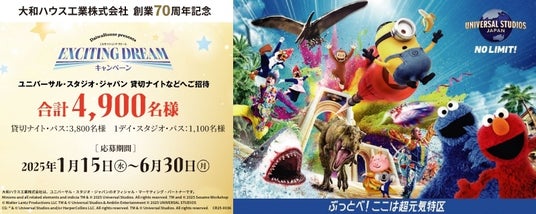 大和ハウス工業株式会社(本社:大阪市、社長:芳井敬一)は、大和ハウス工業株式会社の 創業70周年を記念して、ユニバーサル・スタジオ・ジャパンの貸切ナイト・パスなどが4,900名様に当たるキャンペーンを実施します。