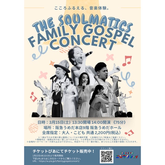 日本を代表するゴスペルグループ『ザ・ソウルマティックス』と子どもたちの学びと体験がテーマの『HANKYUこどもカレッジ』が贈るファミリーコンサート。美しいハーモニーが魅力のゴスペルソングのほか、子ども達に人気の曲目を演奏します。プロシンガーの歌声に触れ、音楽の力で想像力と可能性を育む、素敵な時間をご家族でお過ごしいただけます。
