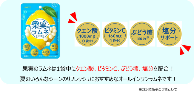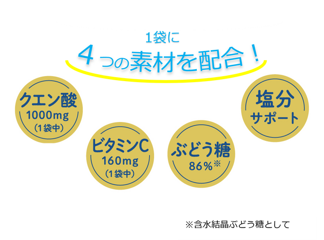 塩分、クエン酸1000mg (*1)、ビタミンC160mg (*1)、ぶどう糖86% (*2) の4つの素材を配合した、レモン風味のラムネです。