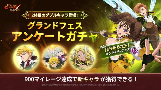 新キャラUR【新時代の王】キング&ディアンヌが登場する「6周年グランドフェスアンケートガチャ」を開催いたします。本ガチャからは、6周年グランドフェスアンケートで選ばれた上位キャラも出現するほか、回数に応じて貯まるマイレージ報酬では、900マイレージ到達で新キャラUR【新時代の王】キング&ディアンヌを獲得できます。この機会にぜひ手に入れてください。