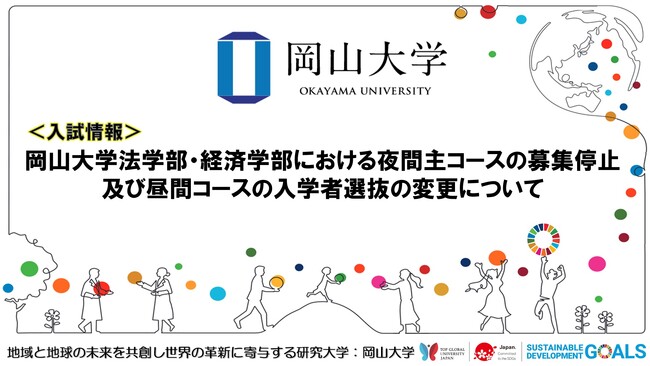 国立大学法人岡山大学(本部:岡山市北区、学長:那須保友)では、岡山大学法学部・経済学部における夜間主コースの募集停止及び昼間コースの入学者選抜の変更について、以下の通りお知らせします。