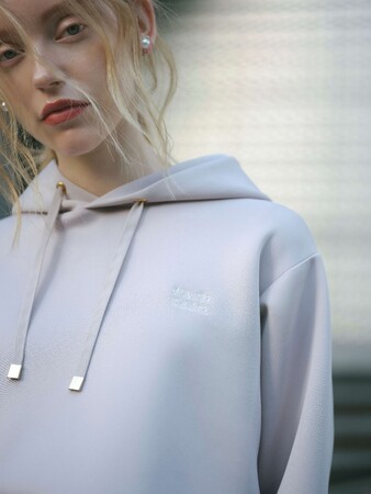 上品なmarie claireロゴが施されたフード付きパーカーを女性らしいドッキングデザインに落とし込みました。