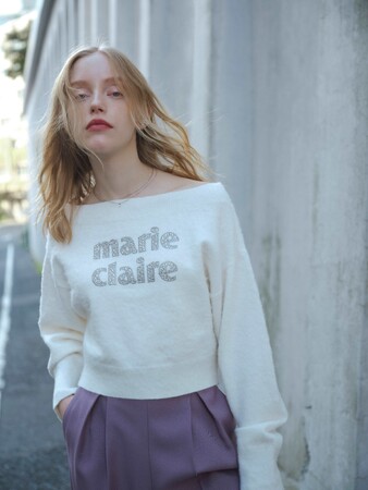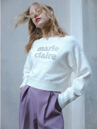 ビジューを敷き詰めたmarie claireのロゴが印象的なニットプルオーバー。