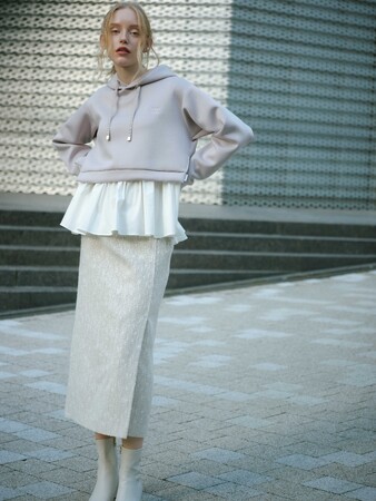 パーカーの裾からフリルを重ねたレイヤードスタイルは、カジュアルな中にもエレガントな趣きを演出します。