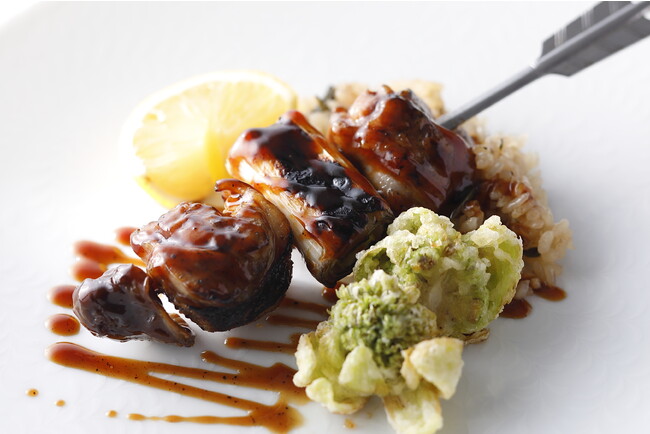 明治時代から昭和初期にかけての「ごはんに合う」としてつくられた洋食の発想も活かして生まれた『はかた一番どりの串焼き 山菜の炊き込みご飯と蕗の薹』 。昆布だしと日本酒を使用したマリネ液に、はかた一番どりのもも肉をじっくりつけこみ、砂肝のコンフィと千住ネギと一緒に炭火焼に。黒蜜を使用した甘辛いてりやきソースがクセになる一品です。また旬の山菜バターライスと、 苦みを感じる春の香り蕗の薹は、素材の味を引き立てる「天ぷら」の調理法により、その苦味が大人の旨味に変わり春の訪れを感じていただけます。