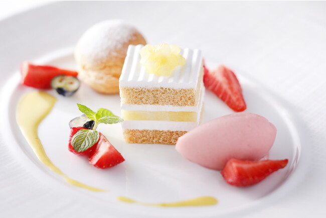 デザートには、ホテルニューオータニの人気スイーツ3種盛り合わせも登場。マスクメロンの香りと甘さが引き立つ極上ショートケーキのスーパーメロンショートのミニサイズに加え、あまおうシャーベット、和三盆シューを添えた『新江戸スイーツバラエティ』もお選びいただけます。