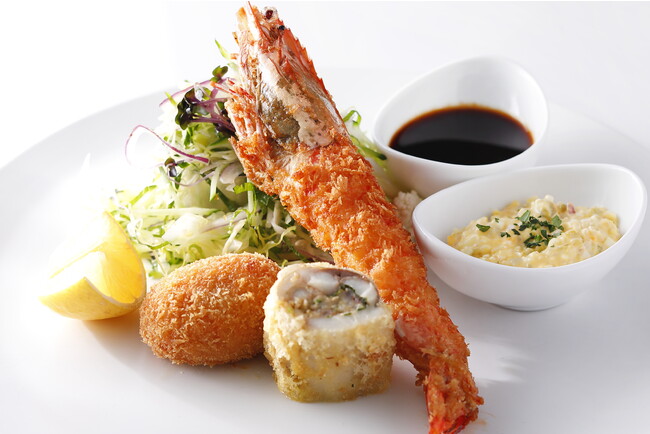 レースのような軽やかな衣をまとった新感覚アジフライ、北海道の雲丹をふんだんに使用したウニコロッケ、そしてボリューム満点の有頭海老フライを盛り合わせにしたまさに“大人のお子さまセット”『シーフードミックスフライ』。東京生まれの深みと旨味があふれるソースと、ピクルスやらっきょうを使用したこだわりの自家製タルタルソースでご一緒にお愉しみいただく、滞在中の海外のお客さまにも人気の一皿です。
