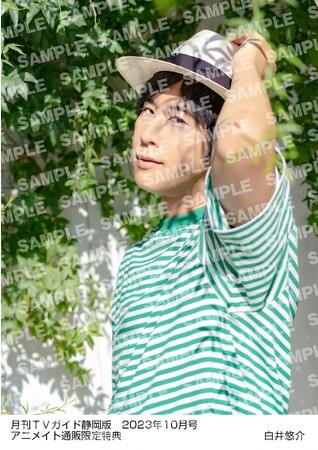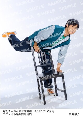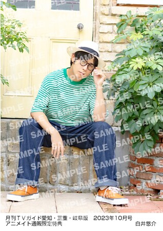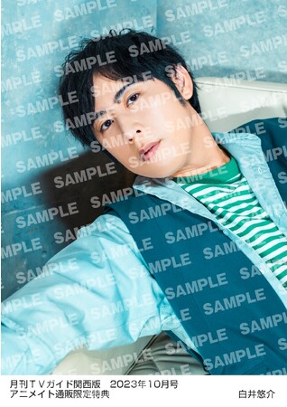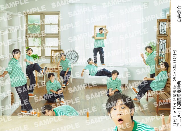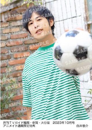 さらに限定企画として、アニメイト通販で「月刊TVガイド2023年10月号」を購入すると、白井悠介の生写真がプレゼントされる特典も実施。夏の日差しの中でサッカーボールを掲げたカットや、白井がこよなく愛する緑色を基調としたカットなど、“しらいむワールド”に浸れる全6種から1種が選べる。