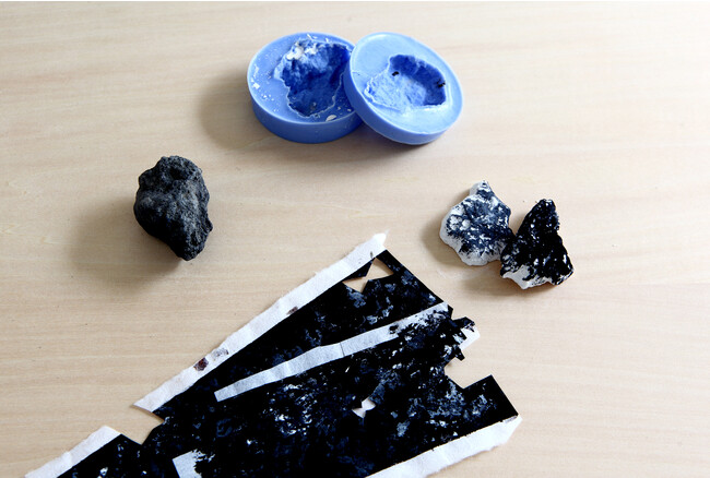 『きょうりゅうオーディション』には、福井県立恐竜博物館の化石発掘場でたしろ氏自身が発掘した化石の模様が写し込まれています。主人公の恐竜・フクイベナートルの黒い蝶ネクタイです。氏が持参した実物の化石を見た子ども達は、見せて見せてと興味津々。「虫めがねでもっとよく見たい」など目を輝かせていました。