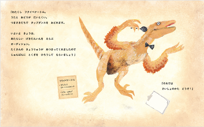 たしろ氏は現在『きょうりゅうオーディション』の続編、『きょうりゅううんどうかい』を制作中。どちらも、ひとりひとりの個性の輝きを尊重する内容で、弱肉強食とは無縁の、ほっこりほのぼのと楽しめる恐竜絵本になっています。
