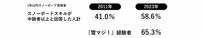 『雪マジ!』ではファミリーになってスキー場に戻って来るには、スキーやスノーボードの熟練度が大切だと考えています。今回の調査ではスキー・スノーボードの熟練度に関して、2011年時点と比較してスノーボードで中級者以上の割合が大きく増えました。『雪マジ!』経験者で見ると、65.3%が「中級者以上」と回答しており、「中級者以上を増やす」という目標は着実に推進できているといえそうです。