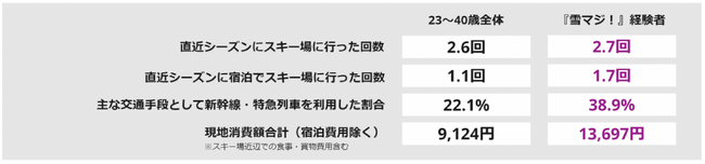『雪マジ!』施策実施のポイントは青年期にスノーレジャーを「無料」で楽しむ点です。スノーレジャー施設がその地域に向けたフリーミアムの概念の起点になり、スノーレジャーの需要創出や地域の活性化につながると考えてきましたが、実際はどう動いたのかを検証しました。結果として、『雪マジ!』経験者は、宿泊を伴う旅行者が多く、現地消費額も高いことが見えてきました。