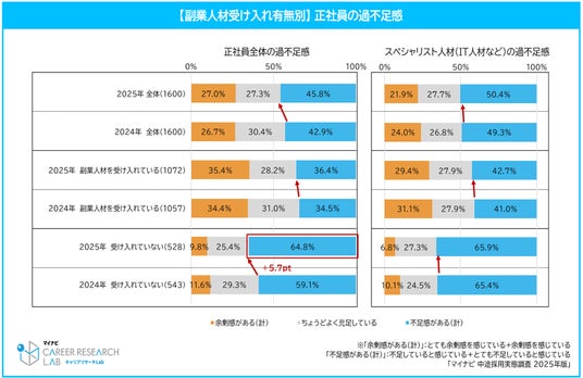 副業人材の受け入れ有無別に比較すると、「不足感がある(計)」割合は、受け入れている場合は36.4%で前年より1.9pt増加、受け入れていない場合は64.8%で前年より5.7pt増加した。