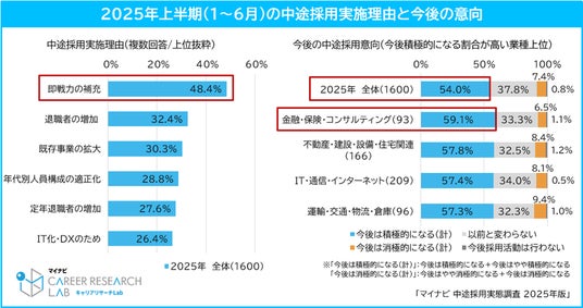 ◆2025年上半期の中途採用実施理由1位は「即戦力の補充」。今後の中途採用においては[金融・保険・コンサルティング]業界が特に積極的な傾向