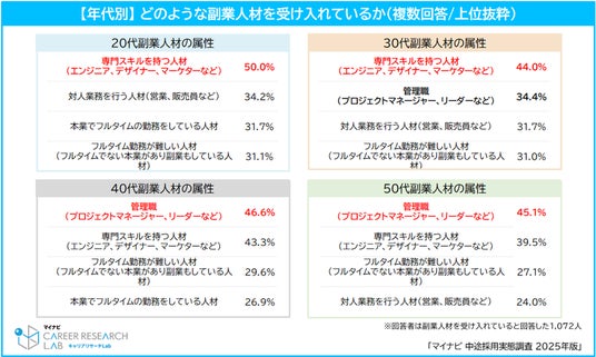 年代別にみた副業人材の属性では、すべての年代で「専門スキルを持つ人材」が上位となり、企業が副業人材に対して高い専門性を求めていることがうかがえます。