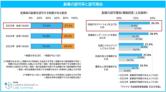 2025年の副業認可率(従業員の副業を認可する制度がある割合)は72.5%で、前年から1.7pt増加した。