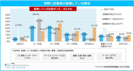 副業を認可している企業の担当者に社内で副業している社員がいるか聞くと、80.8%が「副業している社員がいる」と回答したが、副業している社員の人数については、従業員300名以下(「従業員50名以下」+「従業員51~300名」)では「3~10名」の割合が最多、従業員数300名以上でも「11~50名」の割合が最多と、限定的な規模にとどまっているようだ。