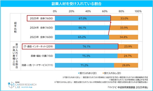 別の企業や団体での業務を本業とする「副業人材」を受け入れている(採用している)企業の割合は67.0%となり、前年から0.9pt増加した。