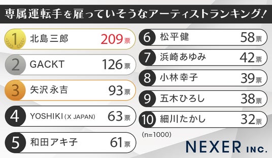ということで今回は株式会社トランスアクトと共同で、全国の男女1000名を対象に「専属運転手を雇っていそうなアーティスト」についてのアンケートをおこないました。