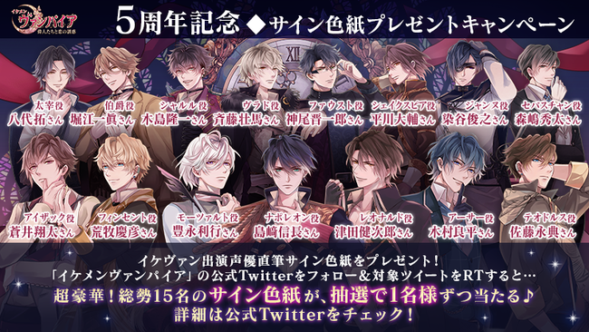 5周年を記念して、『イケメンヴァンパイア◆偉人たちと恋の誘惑』公式Twitter(https://twitter.com/ikemenvampire)をフォローのうえ該当のツイートをRTいただくと、『イケメンヴァンパイア◆偉人たちと恋の誘惑』出演声優の直筆サイン色紙が、それぞれ抽選で【1名様】に当たります。