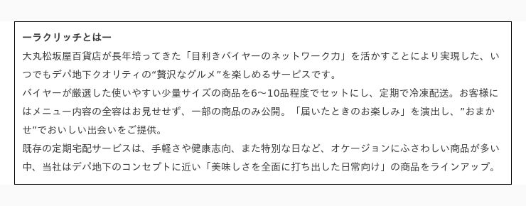 大丸松坂屋百貨店が手掛ける、食通のバイヤーが厳選した冷凍グルメ宅配のサブスクリプションサービス「ラクリッチ」は、現在38ブランド72品の商品を取り揃えています。その中から、2024年1月1日(月)から展開している冷凍グルメのうち、特におすすめの商品をピックアップしてご紹介いたします。